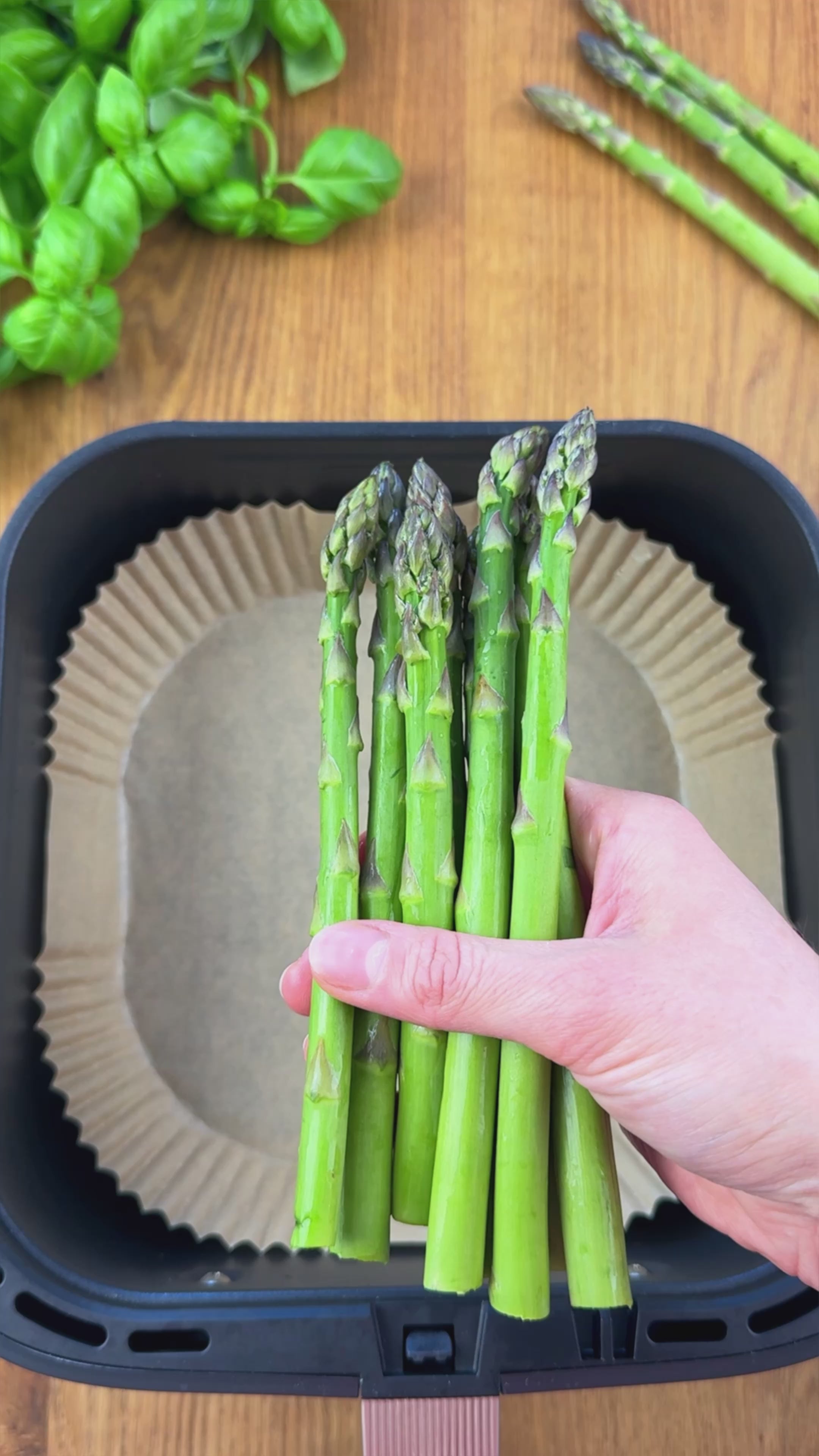 Holzige Enden vom Spargel abschneiden und anschließend den Spargel auf ein Backpapier in den Airfryer legen.
