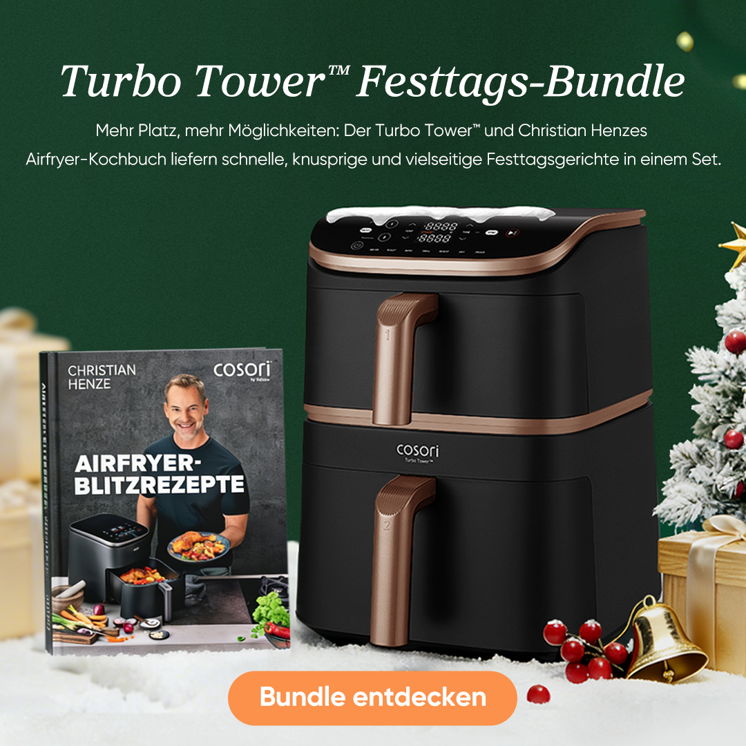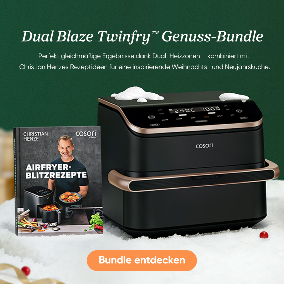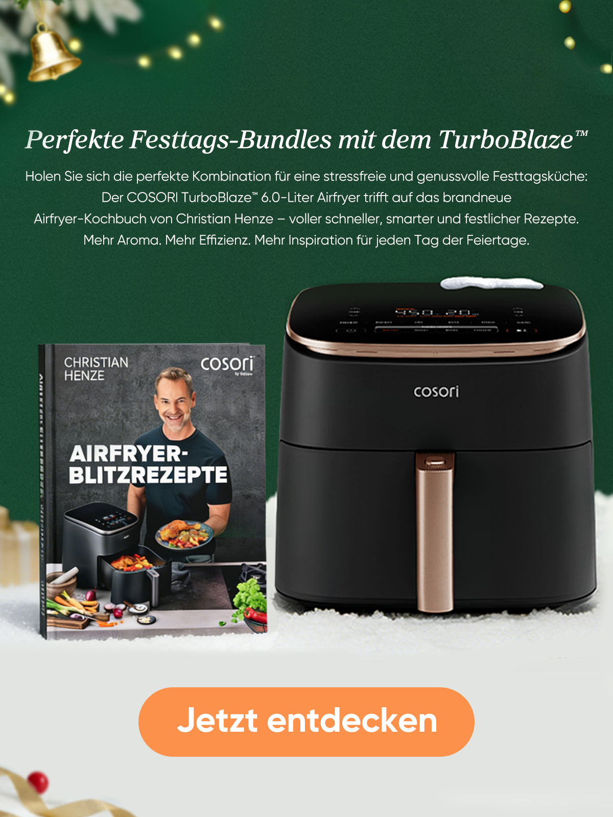 Entdecken Sie exklusive Bundle-Sets aus unseren beliebtesten COSORI Airfryern und Christian Henzes neuem Airfryer-Kochbuch – für schnelle, kreative und stressfreie Festtagsgerichte.