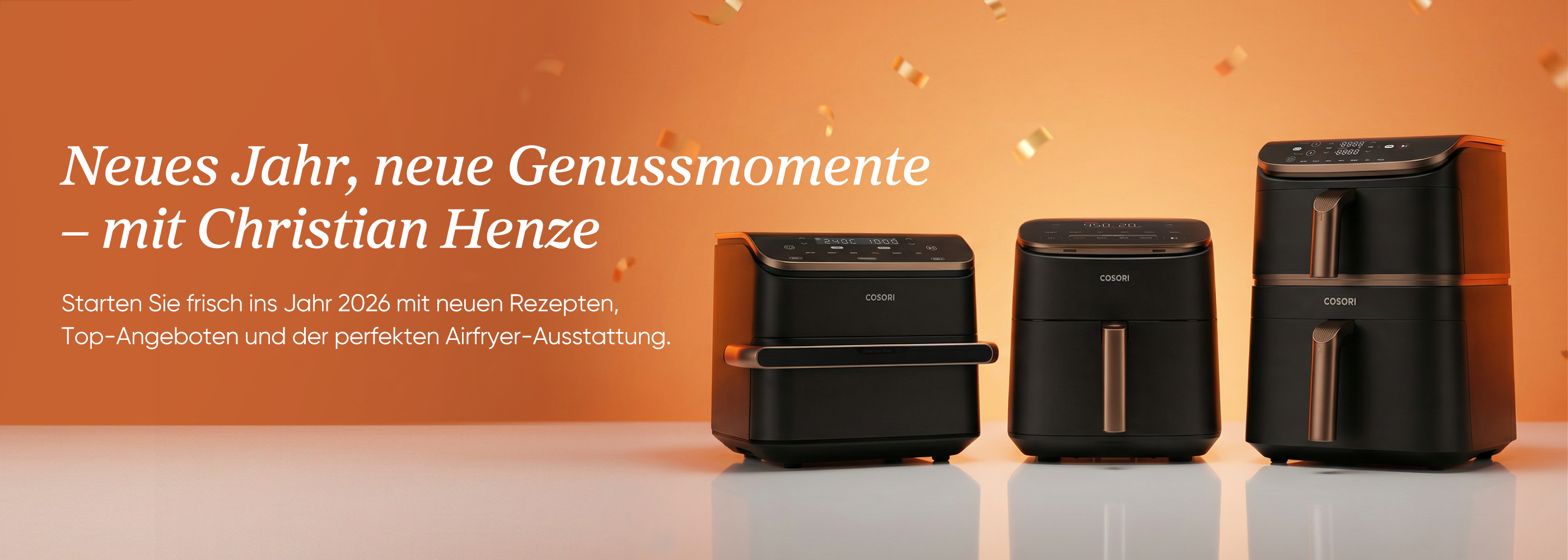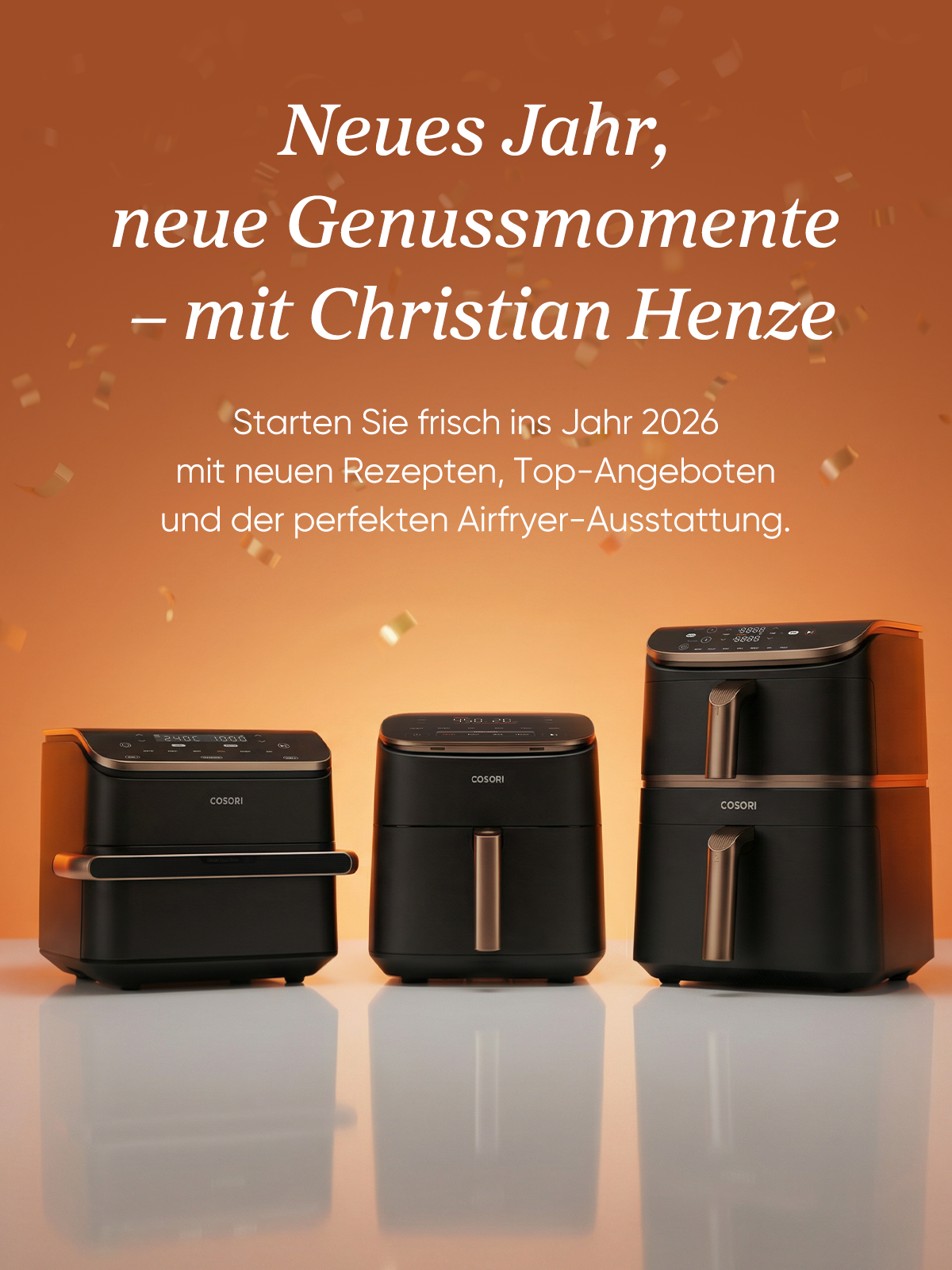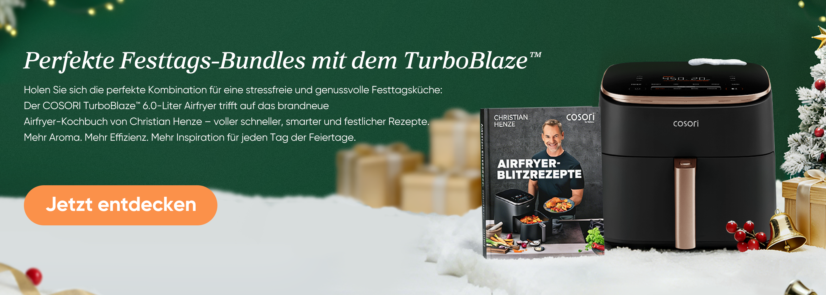 Entdecken Sie exklusive Bundle-Sets aus unseren beliebtesten COSORI Airfryern und Christian Henzes neuem Airfryer-Kochbuch – für schnelle, kreative und stressfreie Festtagsgerichte.