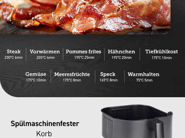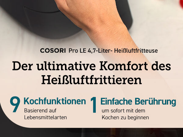Die COSORI Heißluftfritteuse mit 4,7 Litern Fassungsvermögen ist eine kompakte Heißluftfritteuse ohne Öl, ausgestattet mit einem digitalen Touchscreen und 9 Programmen. Mit einer Leistung von 1500W kann sie Temperaturen von bis zu 230 Grad erreichen und eignet sich für 2-4 Personen. Diese Airfryer wird mit einem deutschsprachigen Rezeptbuch geliefert und beinhaltet ein Spießgestell sowie 5 Spieße. Es handelt sich um die Retail-Version.