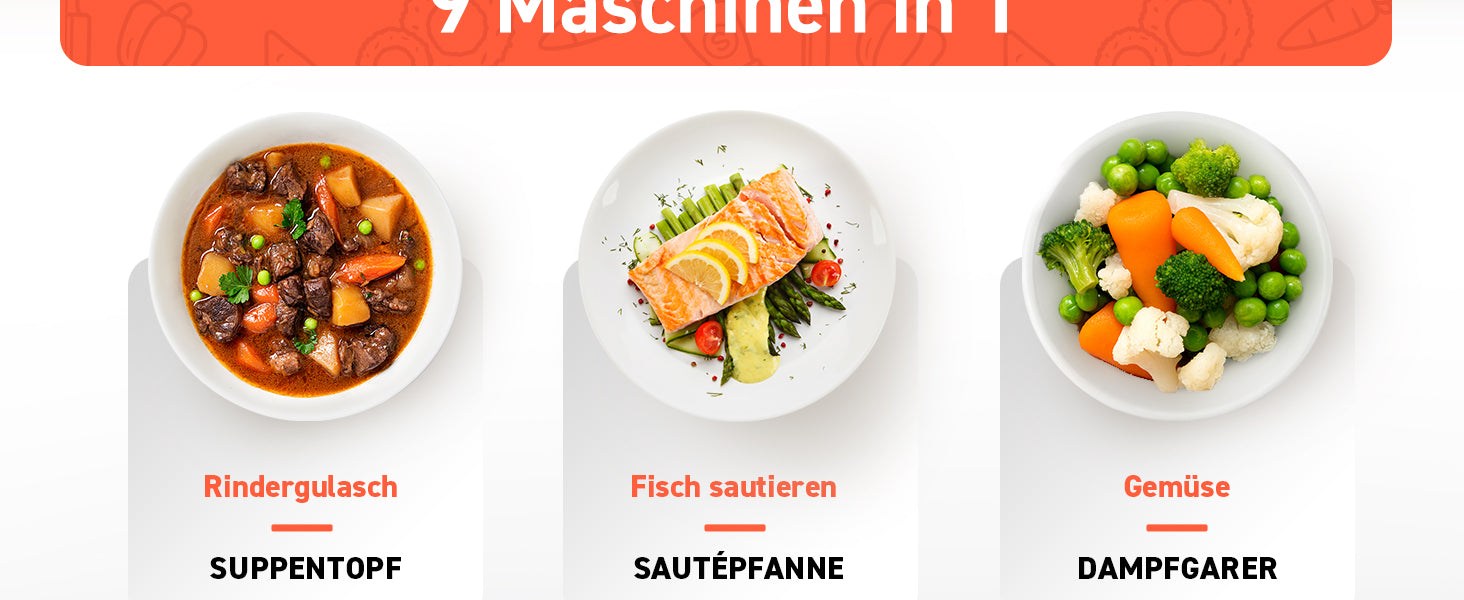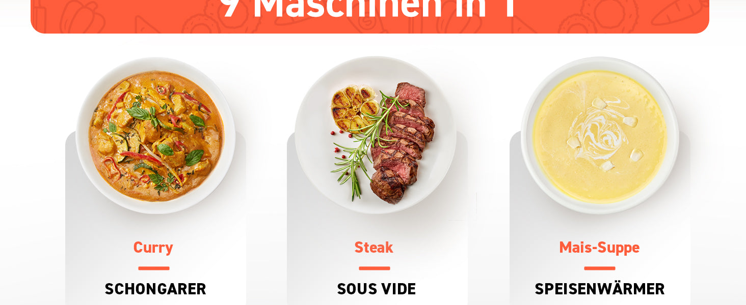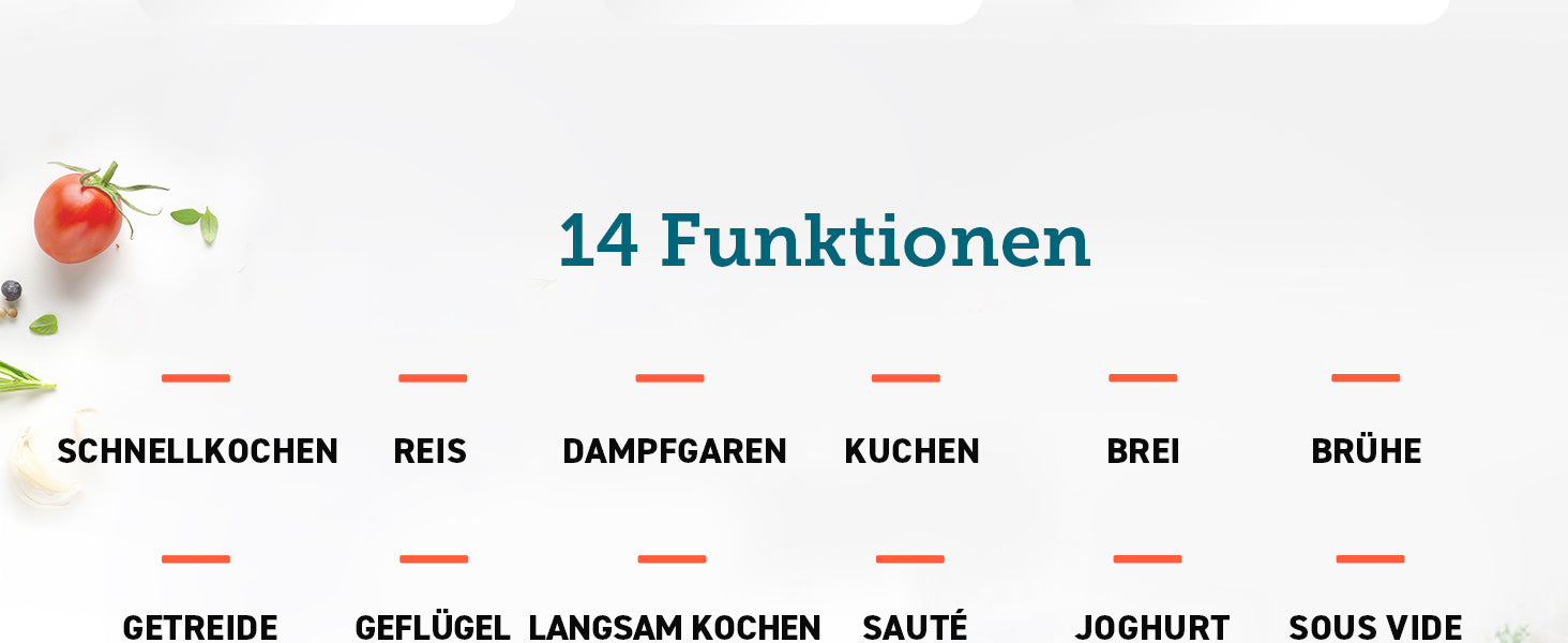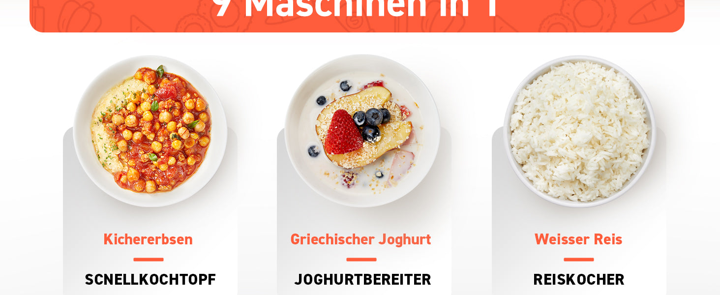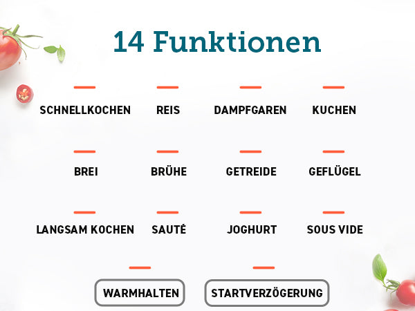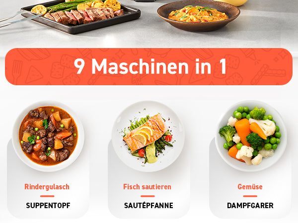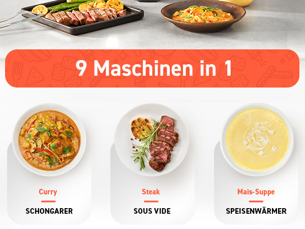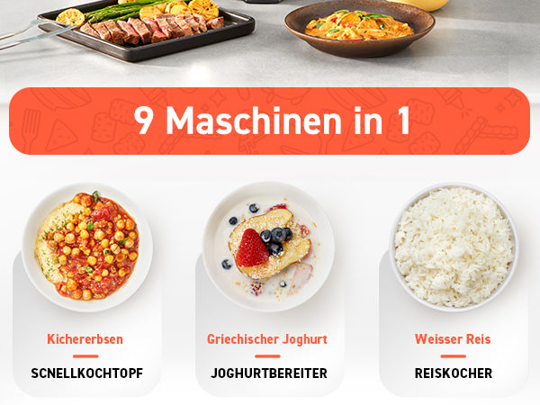 - 9 Geräte in einem: Ersetzt mehrere Küchengeräte! Schnellkochen, Reis, Dämpfen, Backen, Hafer/Porridge, Eintopf/Brühe, Bohnen/Getreide, Fleisch/Geflügel, Langsam kochen, Anbraten, Fermentieren, Langsamgaren, Warmhalten, Verzögerungs-Timer