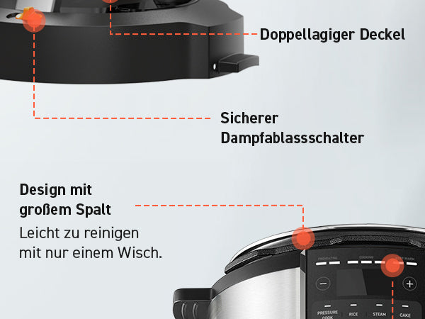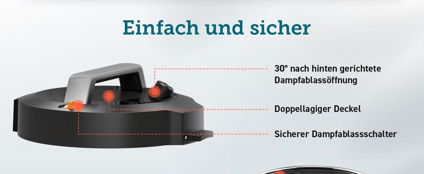 - 12 Sicherheitsmerkmale: Absperr-/Entlüftungsknopf entfernt vom Dampfablassventil, 30° nach hinten geneigter Dampfablass für sicheres und einfaches Entlüften, zweilagiger Verbrühschutzdeckel und Überhitzungsschutz