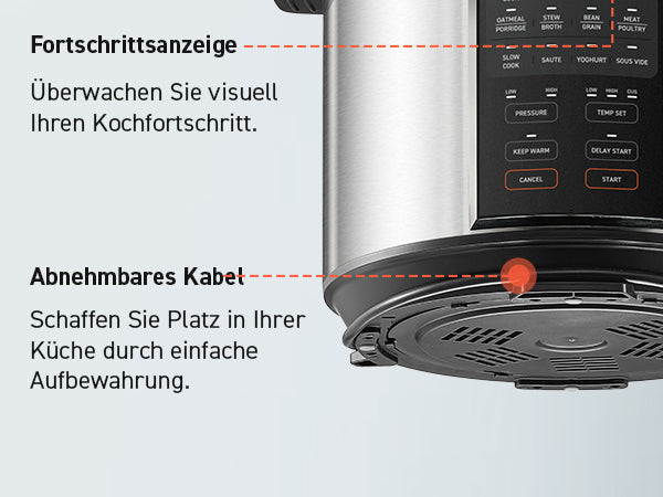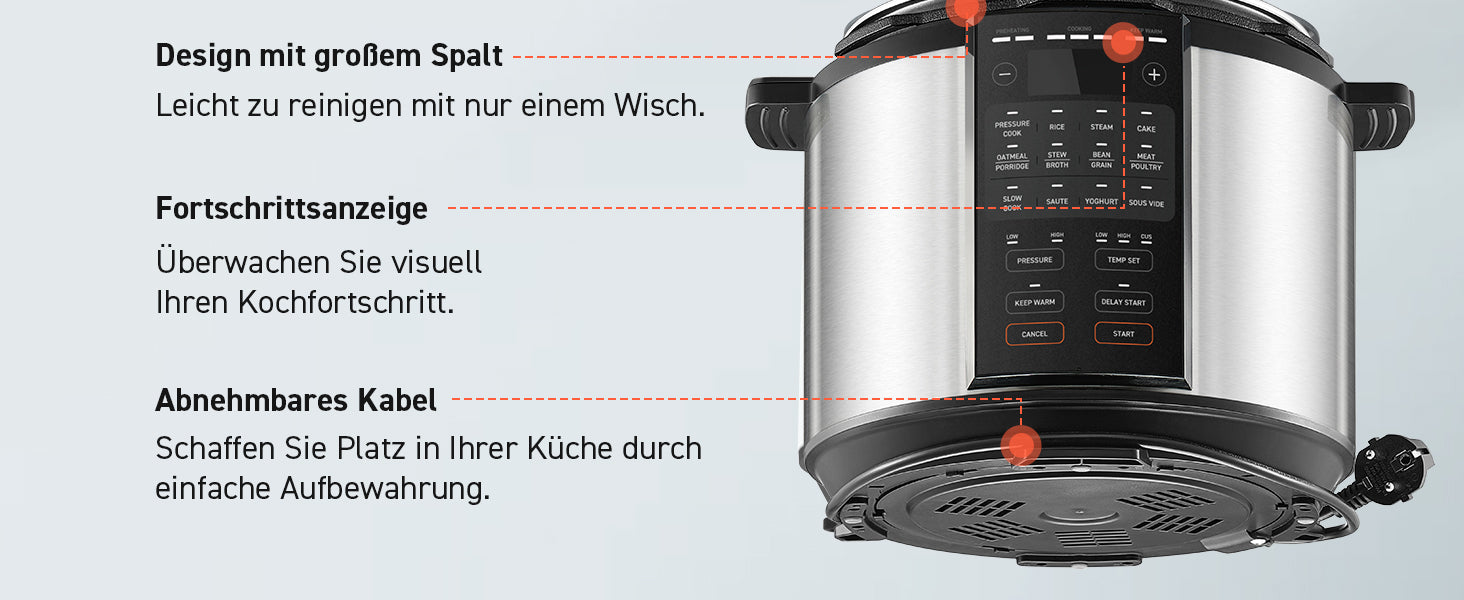 - Einfach zu benutzen: 14 individuelle, intelligente Programme erleichtern das Kochen und die LED-Anzeige zeigt an, in welcher Phase des Kochprogramms Sie sich befinden. Dank des verbesserten Standfußdesigns kann das Netzkabel bequem verstaut werden.