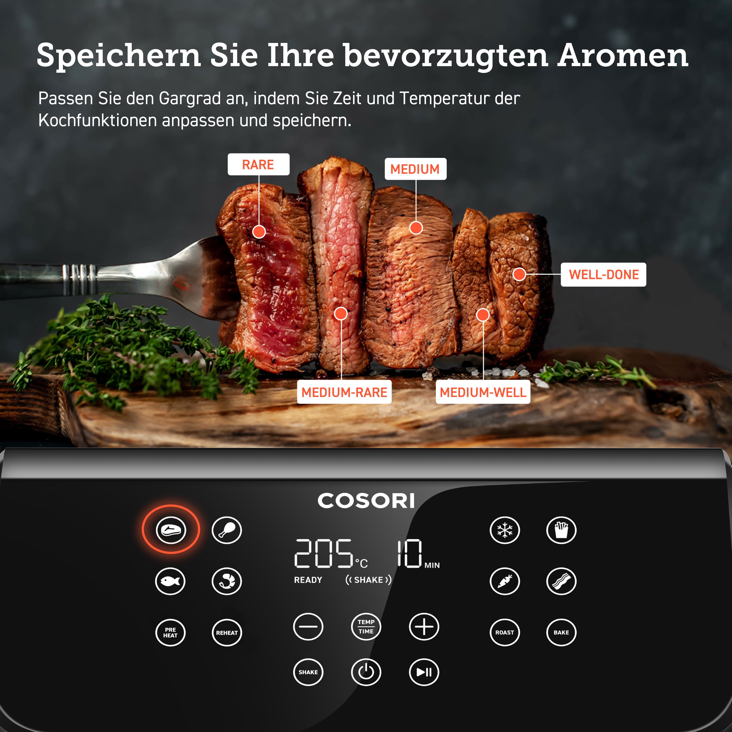 Dank der 13 voreingestellten Kochprogramme wirst du zum Profikoch. Egal ob Steak, Hähnchen, Pommes, Gemüse, Meeresfrüchte oder Desserts. Du wählst das passende Programm für dein Gericht aus und der Premium 2 erledigt den Rest für dich. In der Zeit, wo der Cosori seine Arbeit leistet, kannst du dich um andere Dinge kümmern, wie z. B. das Decken des Tisches oder das Zubereiten weiterer Speisen. Natürlich kannst du noch mehr Gerichte in der Heißluftfritteuse zubereiten und diese mit deinen Liebsten genießen.