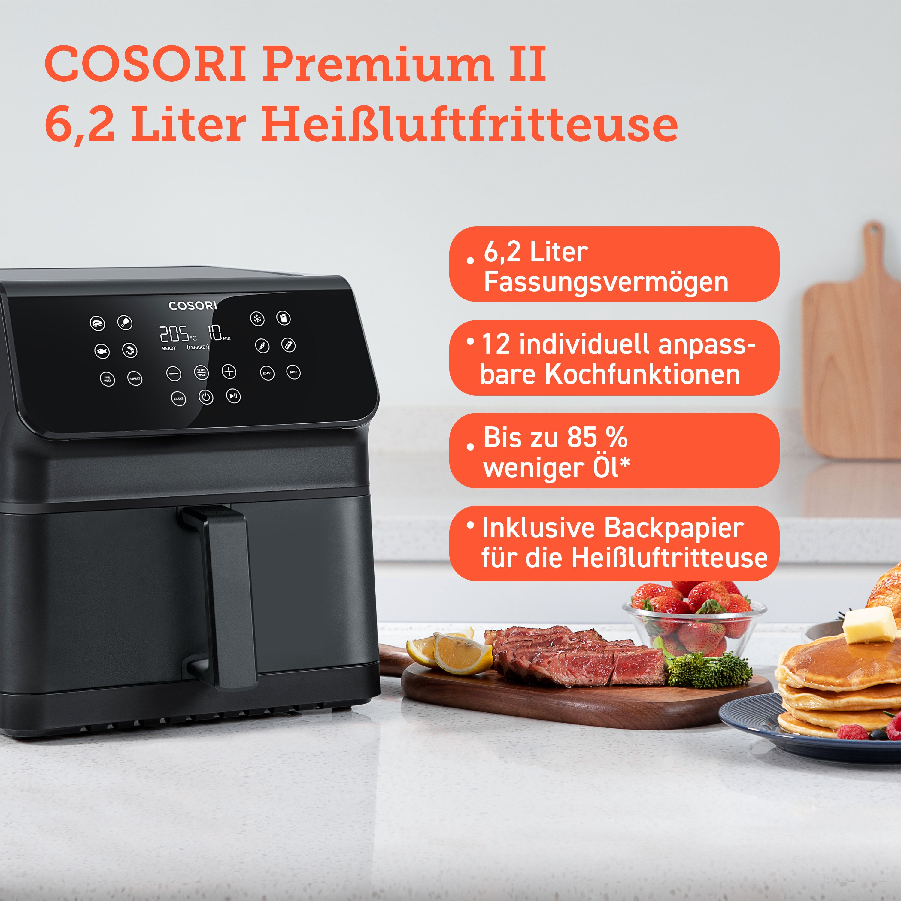 Überzeug dich am besten selbst von unser Heißluftfritteuse Premium 2 Chef Edition von Cosori. Werde zum Profikoch und beeindrucke deinen Besuch mit deinen neuen Kochkünsten.