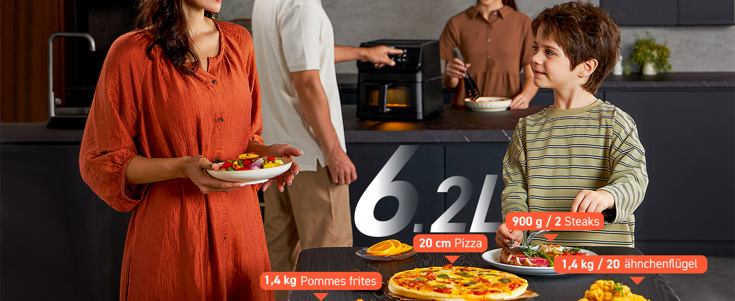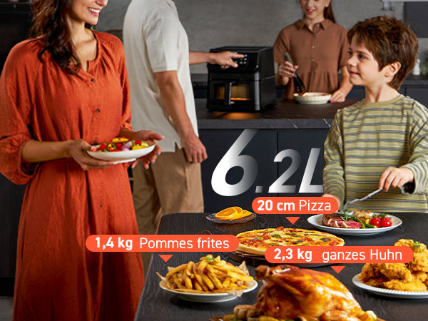 - 【Immer alle satt】 Mit einem besonders großen Fassungsvermögen von 6.2l bietet das Gerät Platz für 1,4kg Pommes, einem ganzen Hähnchen von bis zu 2,3kg (Bitte ohne Backblech) oder einer 20cm-Pizza - und stillt somit problemlos den Hunger von bis zu fünf Personen