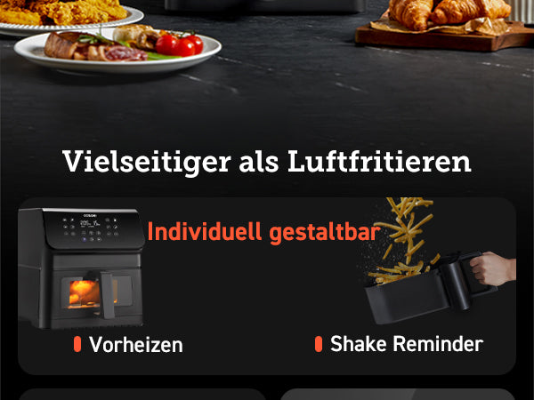 - 【Viel mehr als nur ein Airfryer 】Mit Heißluft frittieren, braten, backen und mehr! Acht voreingestellte Programme helfen dir dabei, deine Lieblingsgerichte mit nur einem Tastendruck zuzubereiten Außerdem sorgen die Vorheizfunktion und der innovative Shake Reminder für ein garantiertes Gelingen deiner Speisen