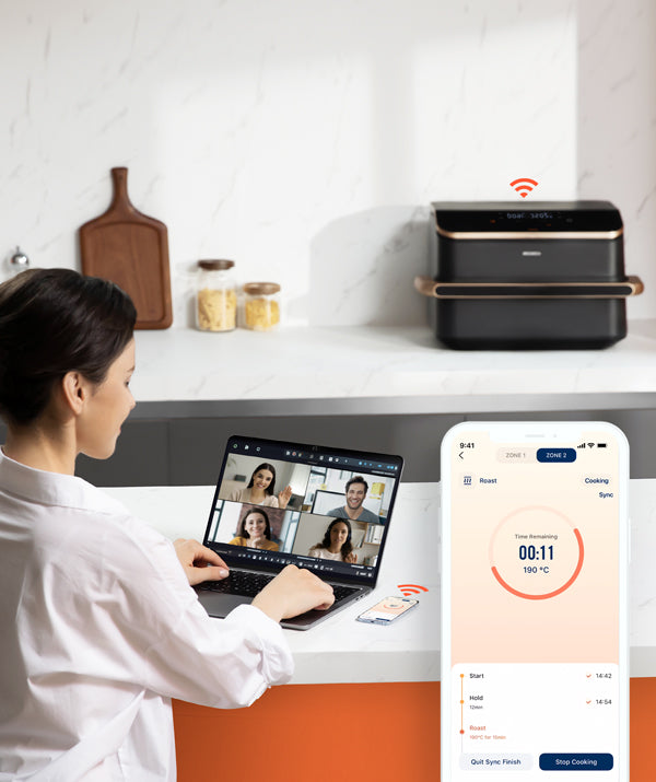 - 𝗜𝗻𝘁𝗲𝗹𝗹𝗶𝗴𝗲𝗻𝘁𝗲𝘀 𝗞𝗼𝗰𝗵𝗲𝗻: Die Sync-Funktion des Produkts passt die Kochreihenfolge der Frittierkörbe automatisch an, sodass beide Gerichte gleichzeitig fertig sind