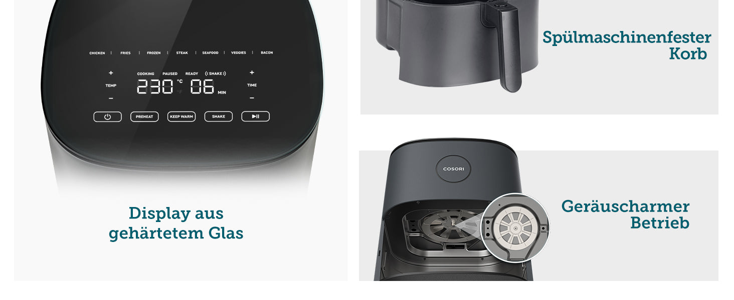 - 【Leise Betrieb】 Mit der neuesten COSORI AIR WHISPER Technologie kann der L501den Lärm unter 55dB halten, so dass Sie ein ruhiges Kochen genießen können
